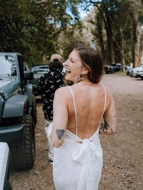My favorite thing about this couple, is their sense of adventure together! After hiking and swimming in a refreshing waterfall we got back to the jeeps at the trailhead and they changed in the jeeps into their wedding day clothes. Brynn's dress was GORGEOUS and Travis's laid back Hawaii look was spot on! Brynn brought some details with them to put on like the cute matching vans and lace socks, gorgeous earrings, and their rings. Look at the cute little rooster who wanted to join every single first look photo!